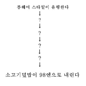 롱헤어 스타일이 유행한다 – 롱헤어 스타일을 가지기 위해 사람들이 이발소에서 머리를 깍지 않는다. – 이발소들의 매출이 줄어든다. – 이발소 주인들의 지출 줄어든다. – 소비 저하로 경제가 나빠져 사람들의 외식(소고기덮밥) 하는 횟수가 줄어든다. – 소고기 덮밥이 98엔으로 내린다.