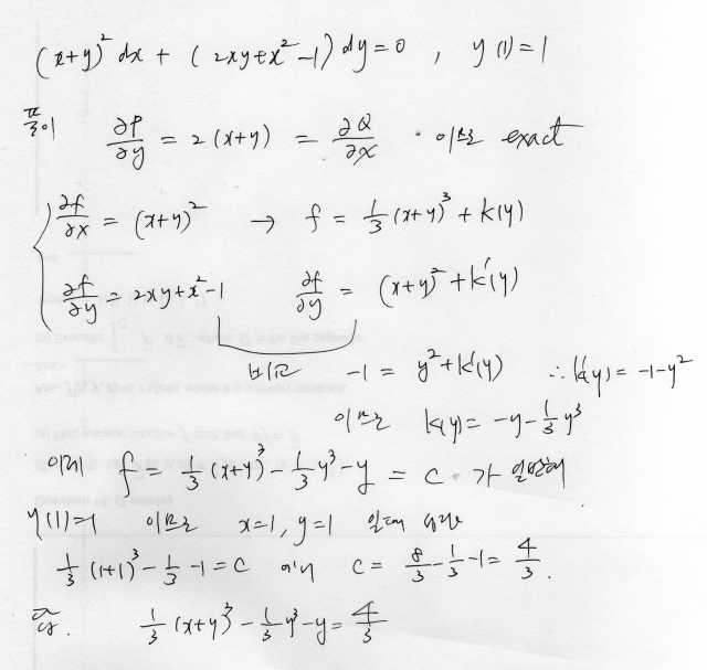 완전미방 (x+y)^2 dx + (2xy+x^2 -1)dy = 0