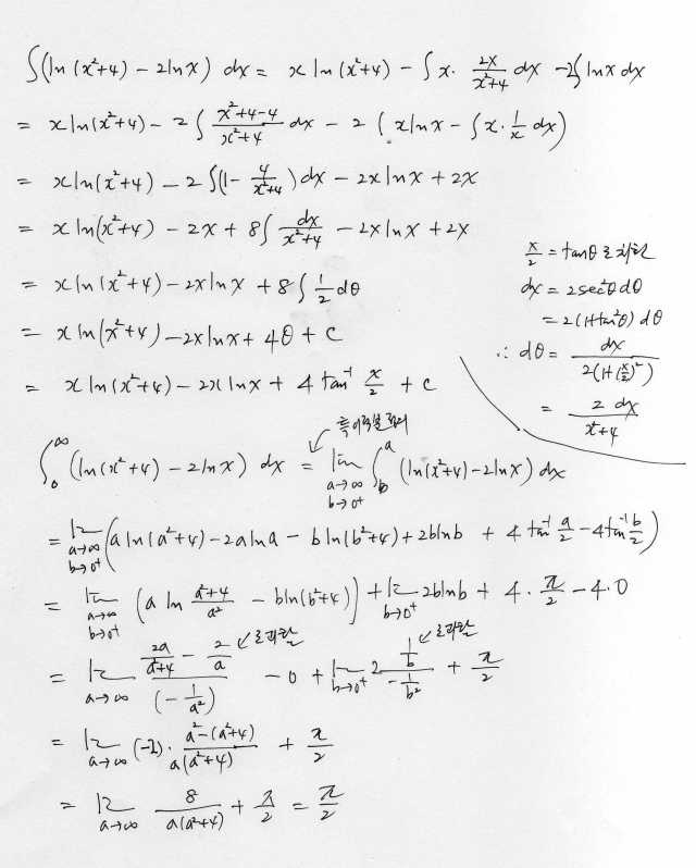 울프램알파 결과 http://www.wolframalpha.com/input/?i=int+%28+ln%28x%5E2+%2B4%29+-+2+lnx+%29+dx