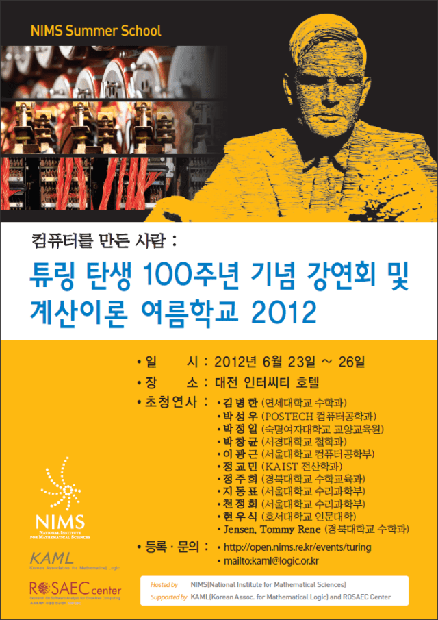 현대 컴퓨터 및 관련기기는 눈부신 발전을 거듭하고 있지만, 아직도 컴퓨터 설계 기저의 계산이론은 튜링이 제안한 튜링기계가 바탕입니다. 이는 그의 학문적 성과가 컴퓨터라는 매체를 통해 현대사회 전반에 얼마나 크게 영향력을 미치고 있는가를 나타냅니다. 이번 강연회 및 여름학교를 통해 컴퓨터의 탄생에 기여한 수리논리학자들의 공헌을 되새기고, 컴퓨터 계산이론의 중요성을 인식시키는 교육의 장을 마련하고자 합니다.
